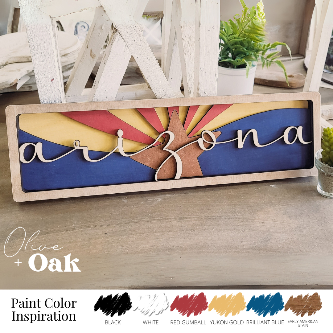 Make a statement in your home with this 5"x16" Arizona Frag Shelf Sitter! Featuring a waving flag with the word "Arizona" at the center, this shelf sitter sign will show your Copper State pride!