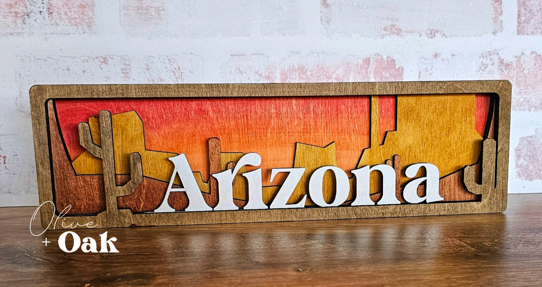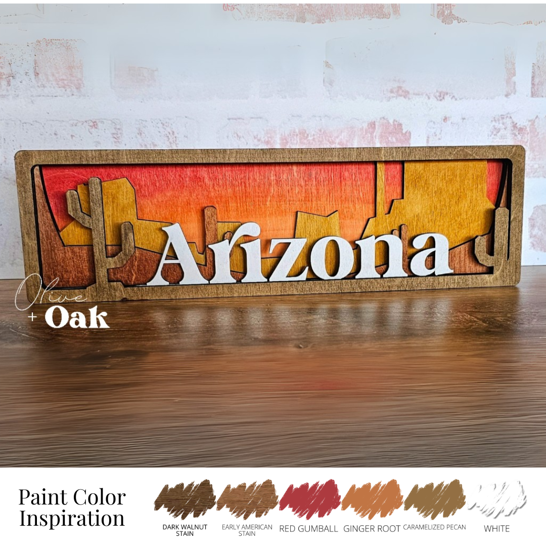 Make a statement in your home with this 4.5"x15" Arizona Desert Shelf Sitter! Featuring a vast desert scene and cacti, this shelf sitter sign will show your Copper State pride!