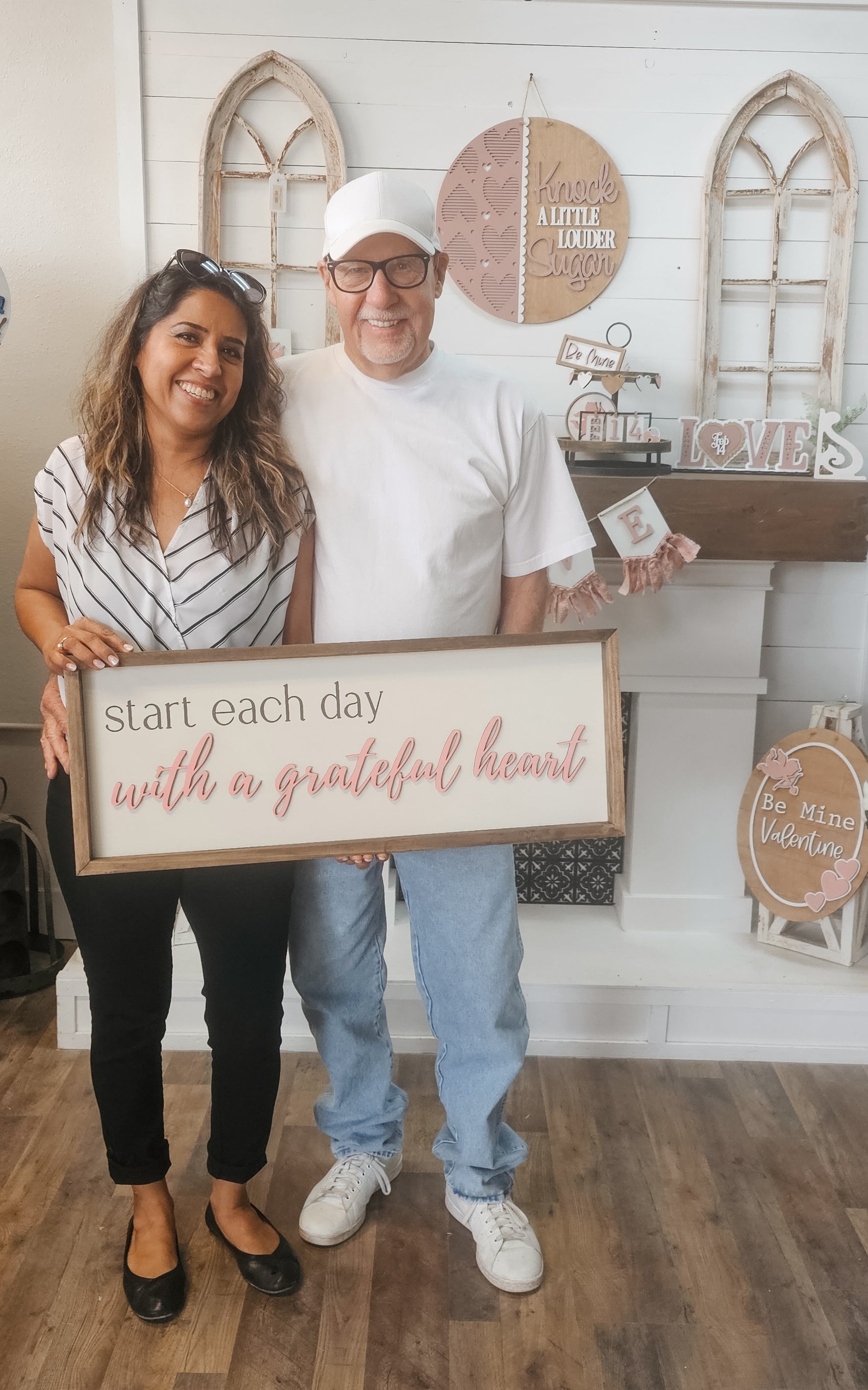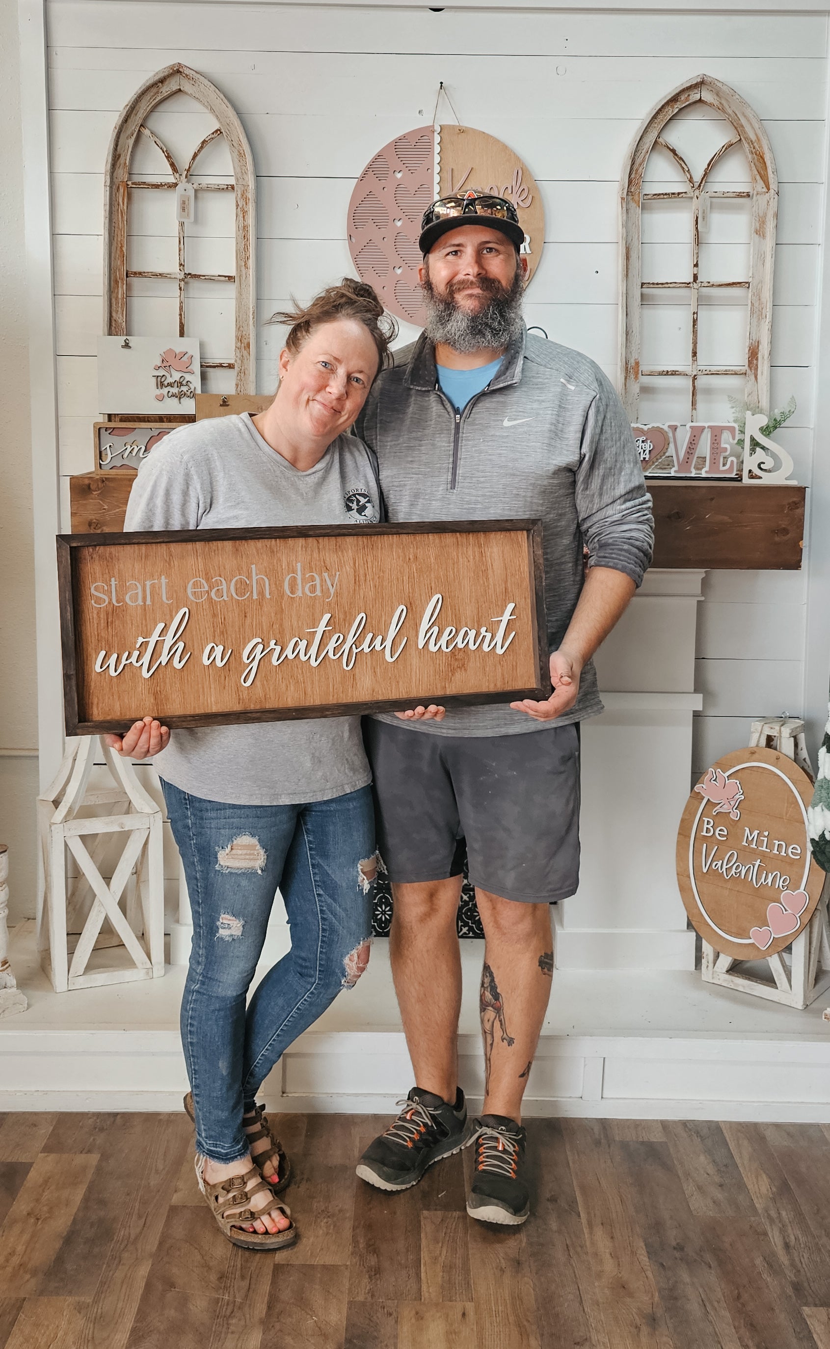 This design features both stenciled sections and 3D lettering and is perfect weddings, anniversaries, housewarmings or just as a fun décor piece for your own home! This is a 12" x 32" framed sign